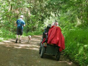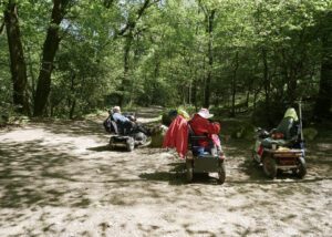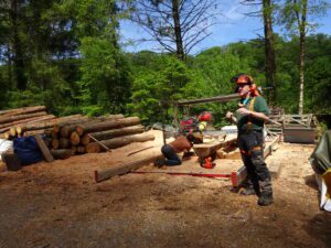 Today there was a small group of WAG members, for the route from Pullabrook to Manaton, using the Byway starting near Yarner Woods. Three of us on buggies accompanied by one walker, met at the Drakeford Bridge/Pullabrook car park. We had only traveled a few hundred yards into Pullabrook Woods where we stopped to talk to two men operating a portable sawmill.
