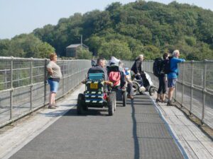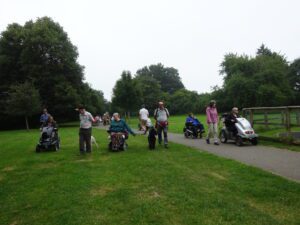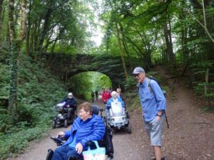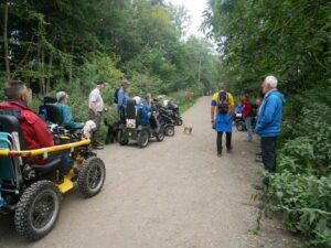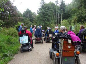 This walk is the final one of this years festival, it is also the first time we have had dry conditions for all 8 walks. We had our best turn out on this walk, 14 mobility scooters/power chairs. We met in Bovey Tracy for a short walk, along the Wray Trail, through the National Trust Parke Estate.