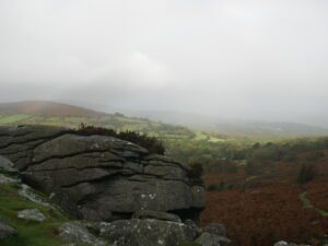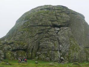 We were able to sit in the lee of Smallacombe Rocks for lunch, which sheltered us from the wind and drizzle. On our way back the DNPA staff left us at the Quarry, and we went up to Haytor Rock. It was still early and the drizzle had eased, so we decided to explore around Haytor Rocks.