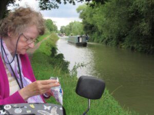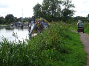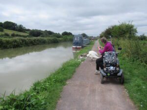 This is one of the points where the canal is wider, so that the boats can turn around. The towpath on todays section, was much more mobility scooter friendly. Which meant that it was easier to pass cyclists and walkers.