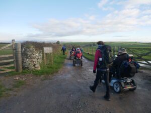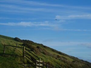 On the way we stopped for several minutes to watch a Kestrel hunting, on the grass slopes either side of the track. After about 2.5 miles we reached the point where the coast path crosses a lane, with a kissing gate and a padlocked farm gate. The member with the buggy with the shortest range, was concerned about getting back. As the wet muddy conditions had drained his batteries. The problem with disabled access will be fed back to the SWCPA, with the hope it will be resolved.