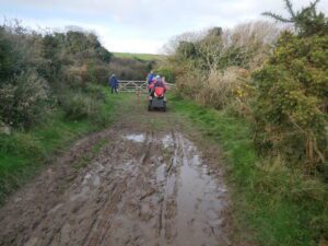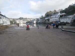 The group today consisted of 4 on buggies and 4 walkers, with us being out in the open we were able to social distance. Even in normal circumstances, we always seem to naturally spread out, so it is easy to obey the current rules. There was one very short section of track, where I had to be very careful, to avoid tipping my 3 wheeler over. Once we were on the asphalt road in Noss Mayo, there was a short icy stretch on the hill where the walkers had to be very careful.