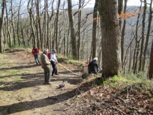 When we had reached the top, one of the buggies cut out, and would not work at all. It was decided to free wheel the buggy back down the hill. One walker alongside the buggy, operating the brake, with two other walkers behind using a tow rope as additional braking on the steep path.